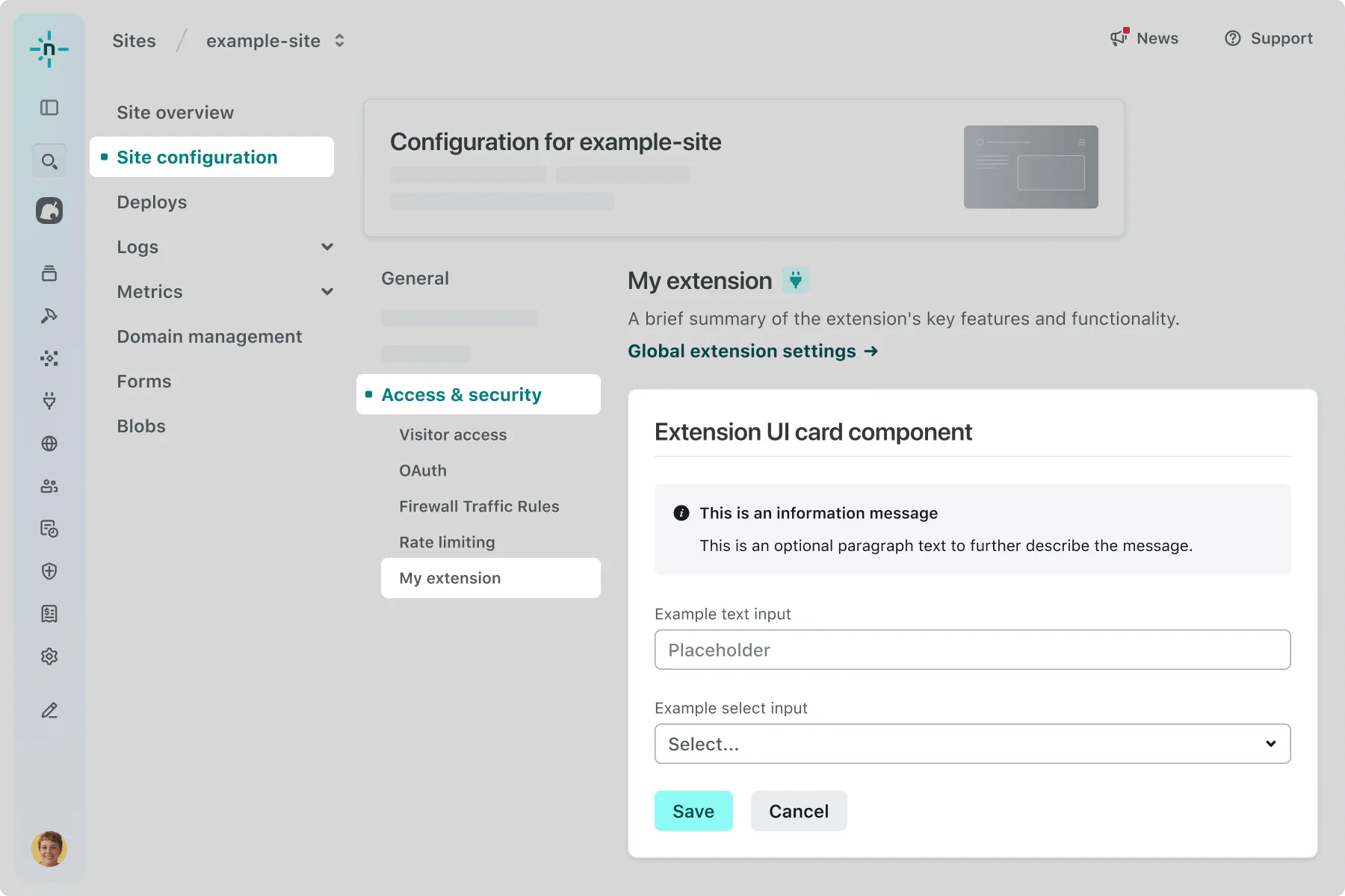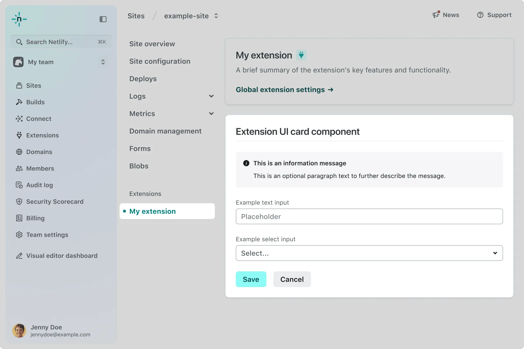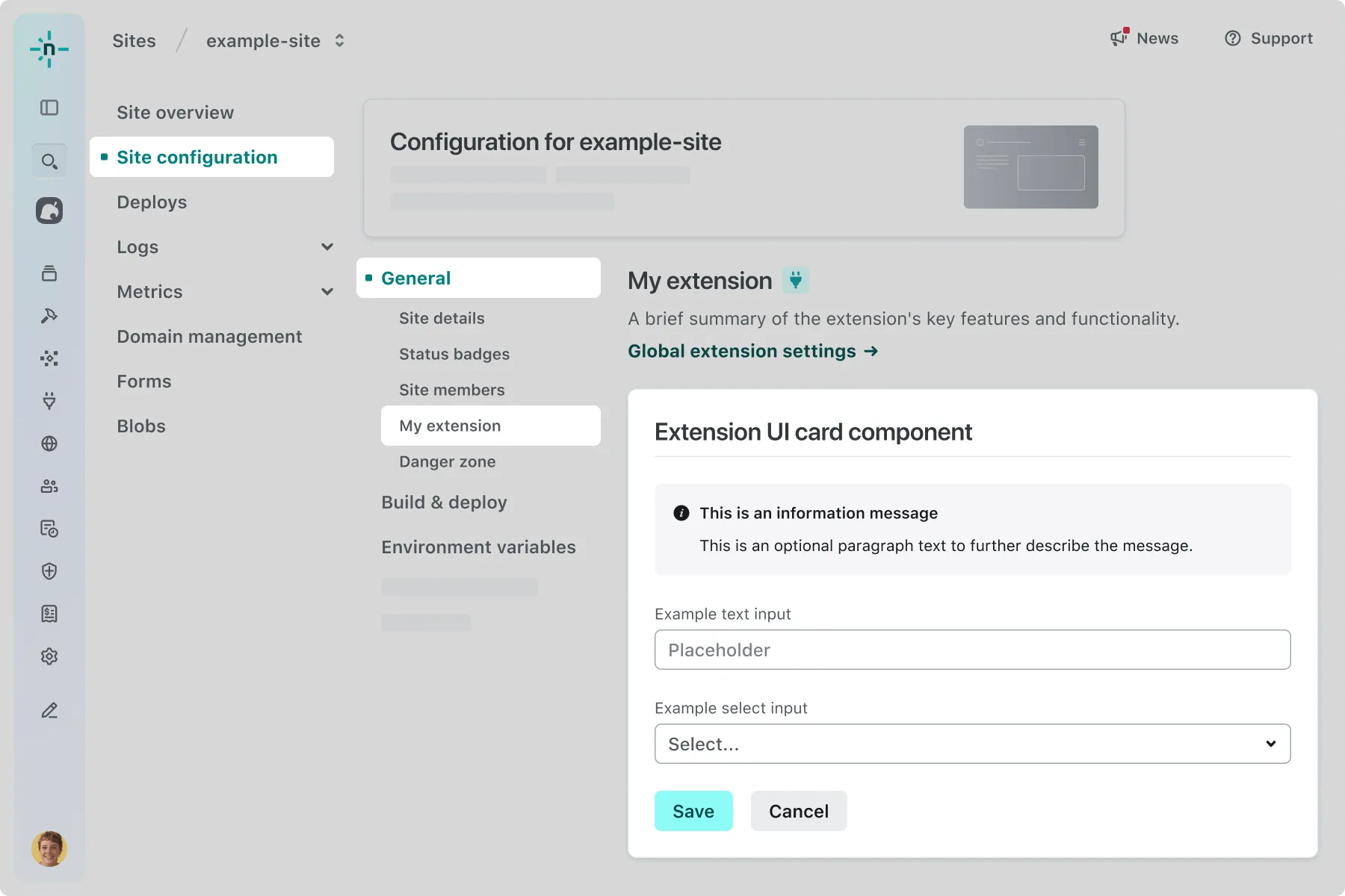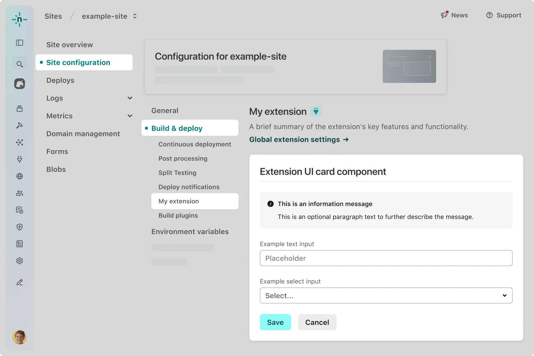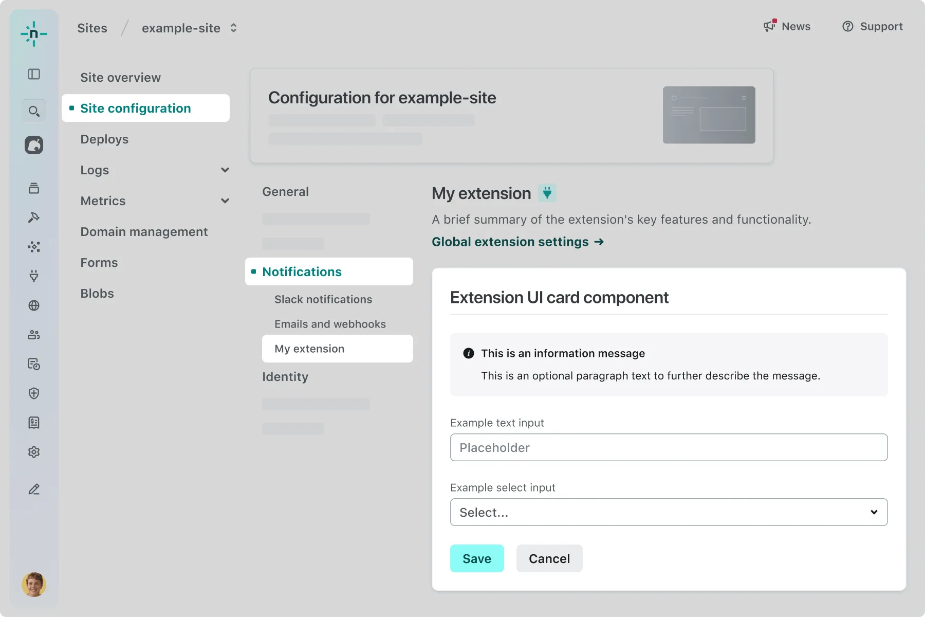 extension-site-notifications-configuration.extension.yaml config:ui:surfaces:- extension-team-configuration- extension-site-notifications-configurationThis signals to the Netlify UI that it should show your extension UI when a user installs your extension and navigates to Project configuration > Notifications.